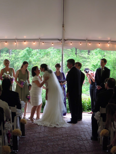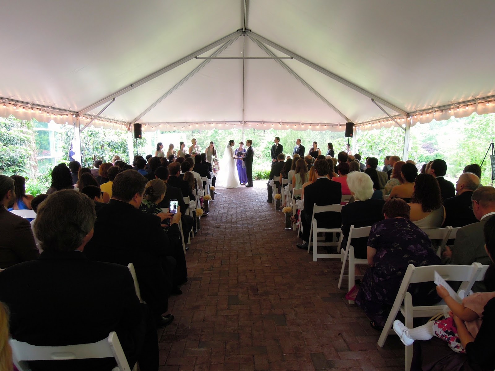 Their wedding day was May 11, 2013 and the weather forecast was foreboding of stormy weather all week for Saturday. So the tent was put in place and if the weather was too bad, the interior of the museum would be our alternate site. But, surprisingly, the storms held off and we were able to have a lovely ceremony outside under the tent.